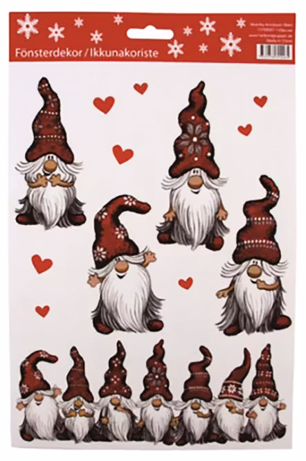 Ett ark med självhäftande tomtar och röda hjärtan. Arket mäter 200 x 270 mm.