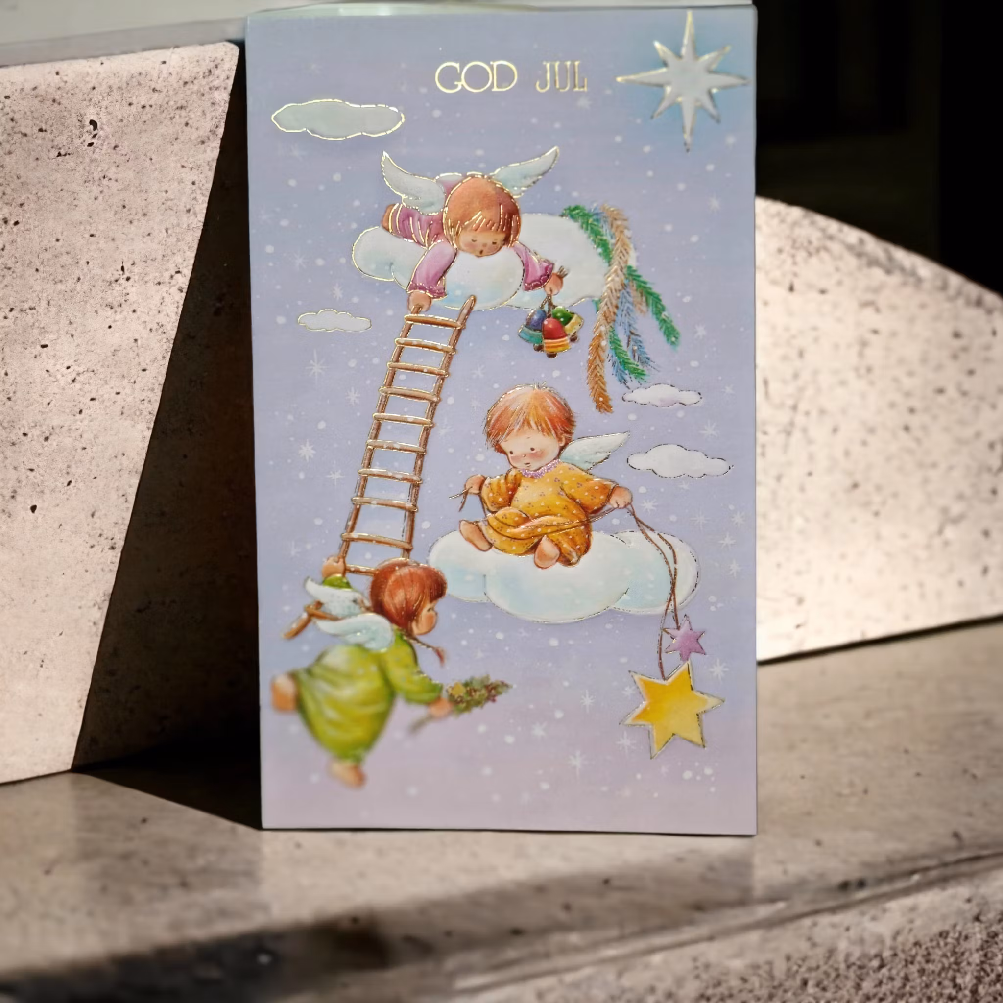 Jättefint dubbelt julkort med lekande småänglar och texten "God Jul, Gott Nytt År" på insidan. Storlek på kortet ca 18X11 cm. Kuvert medföljer.