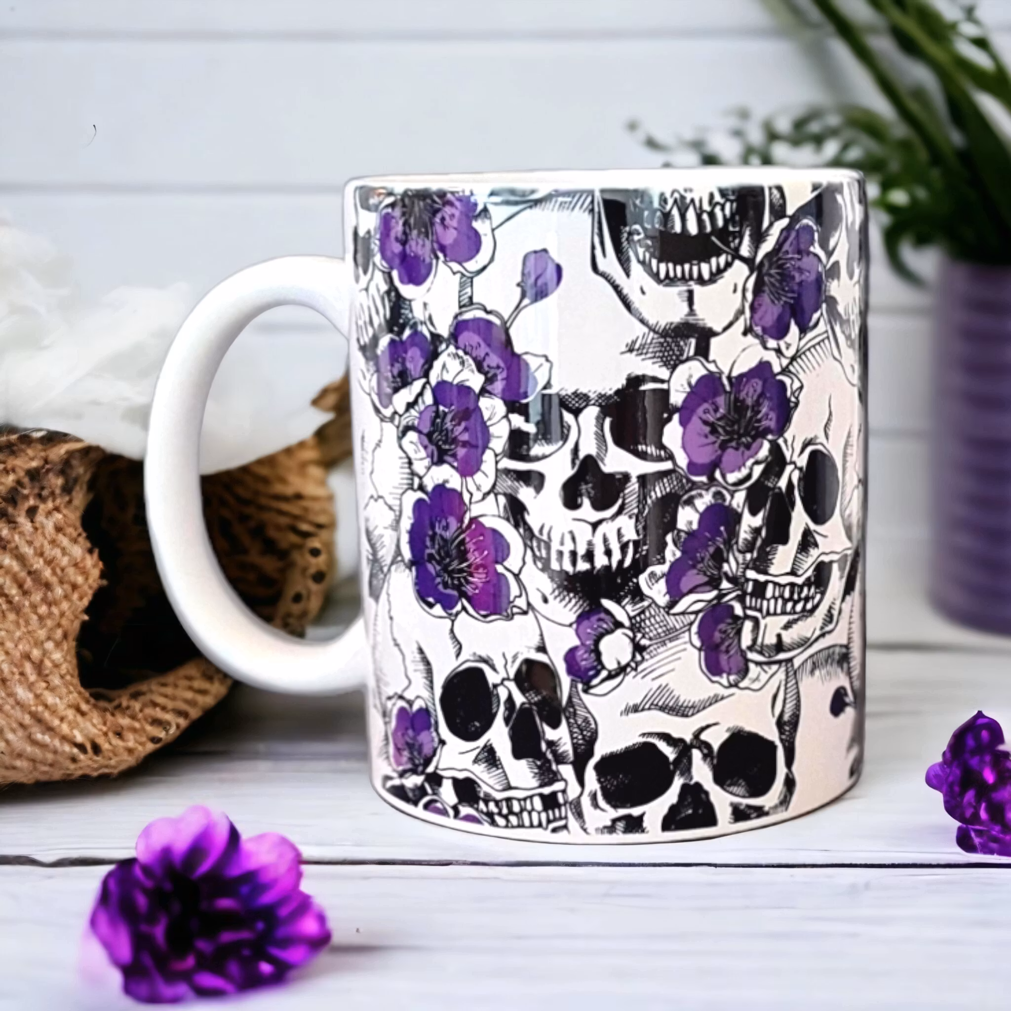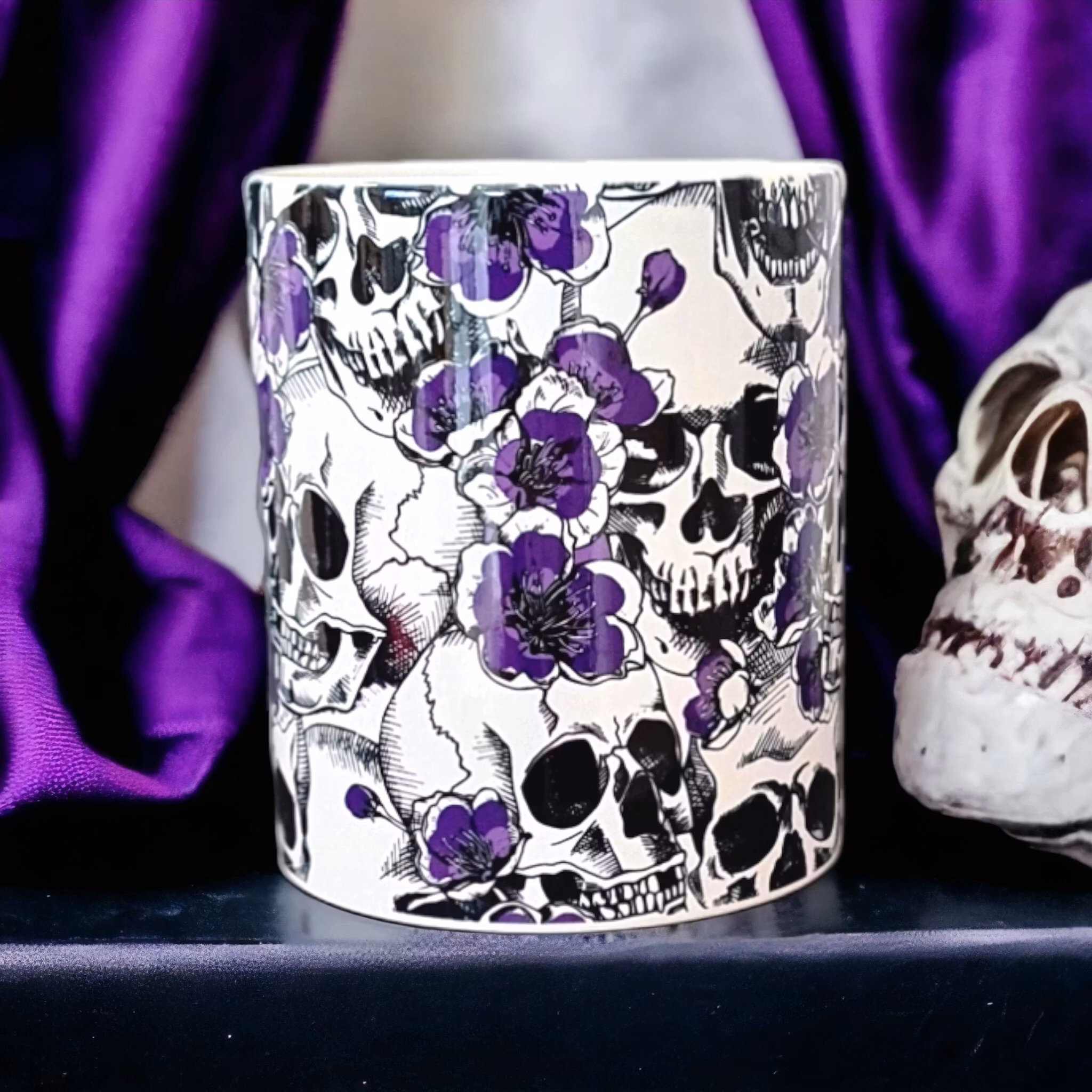 De lila blommorna mjukar upp dödskallarnas mörka charm – en perfekt kombination för dig som gillar kontraster och vill ha något unikt i köksskåpet.