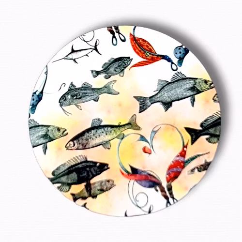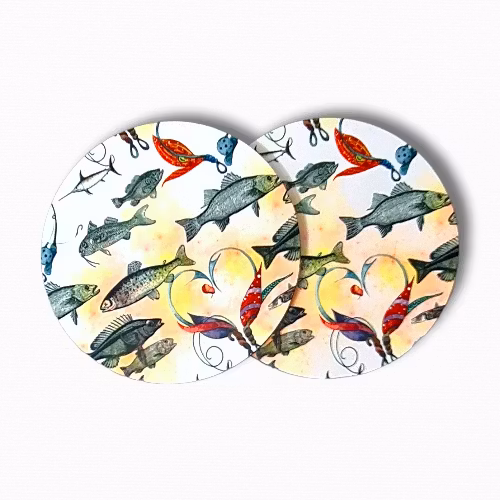 Snygga glasunderlägg i 2-pack med fiskar och krokar format som ett hjärta. Underlägget är gjort i HDF med kork på undersidan. Passar fint med muggarna i samma mönster.