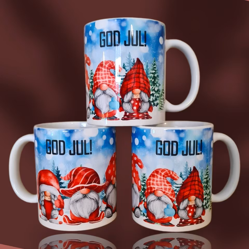 Vit mugg med charmiga tomtar och texten "God Jul" på båda sidor – perfekt för både höger- och vänsterhänta.