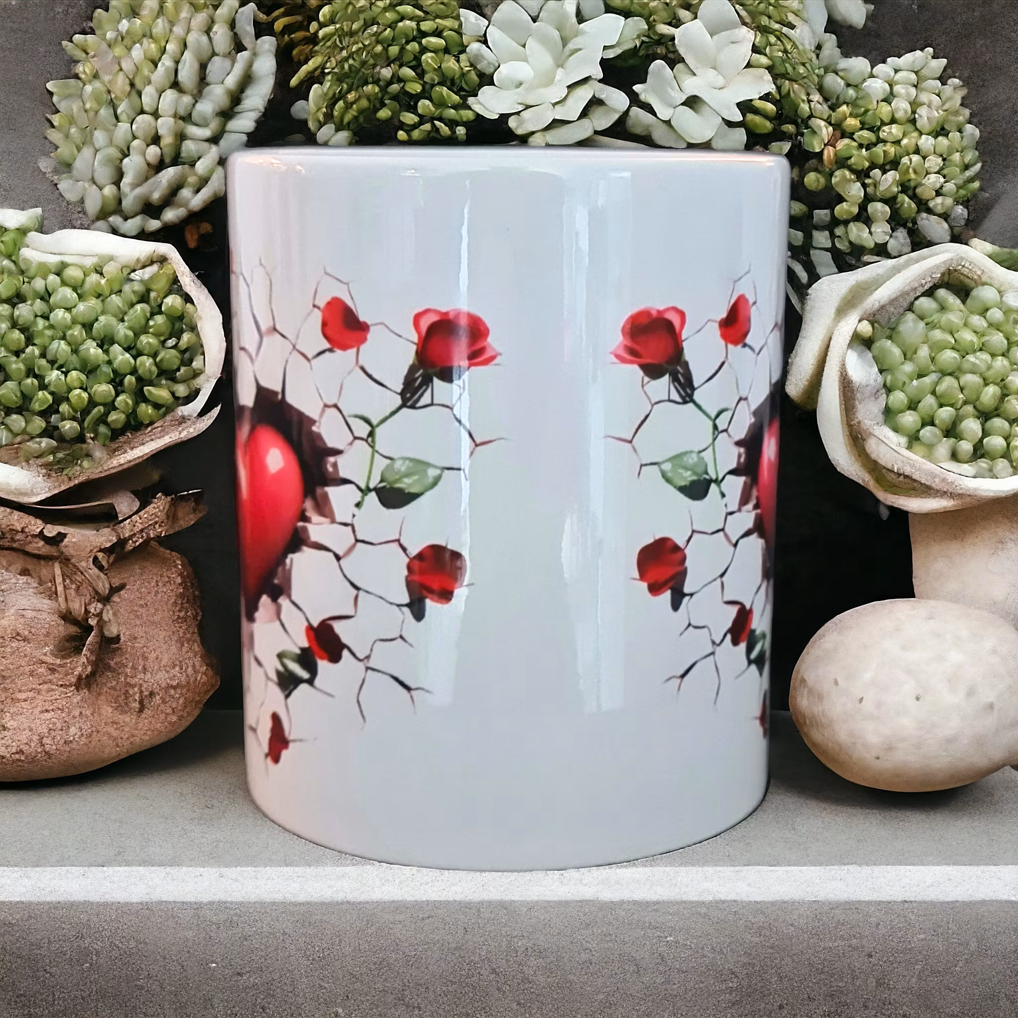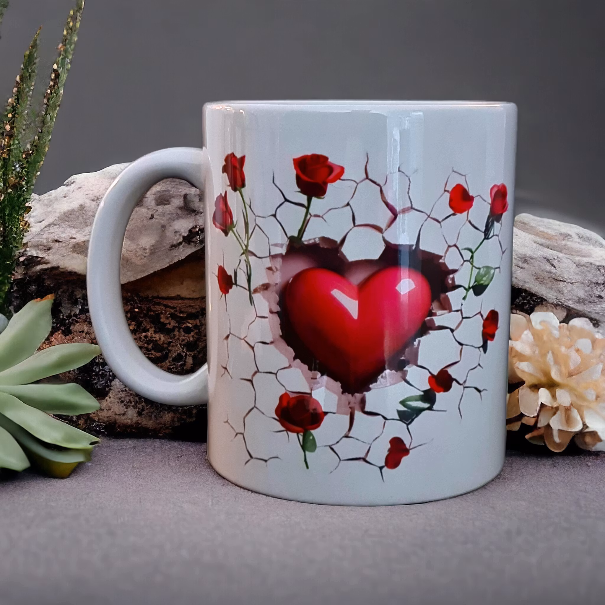 Med rosor som blommar i tredimensionell illusion och hjärtan som viskar små kärleksförklaringar, blir denna mugg en självklar följeslagare för både romantiska fikastunder och morgnar som behöver lite extra hjärta.
