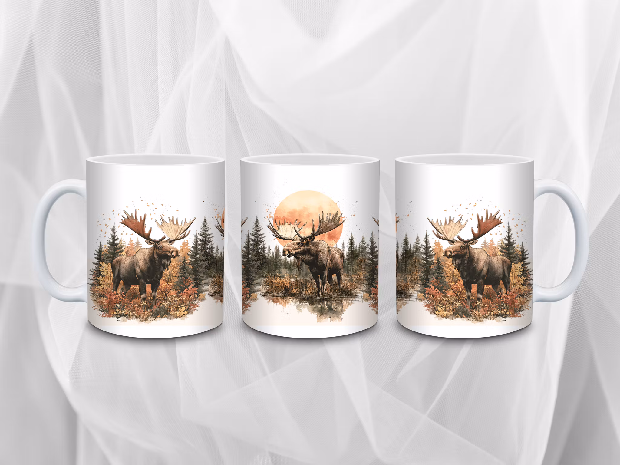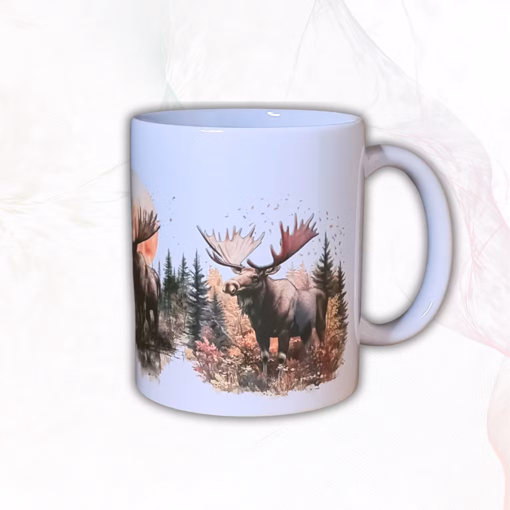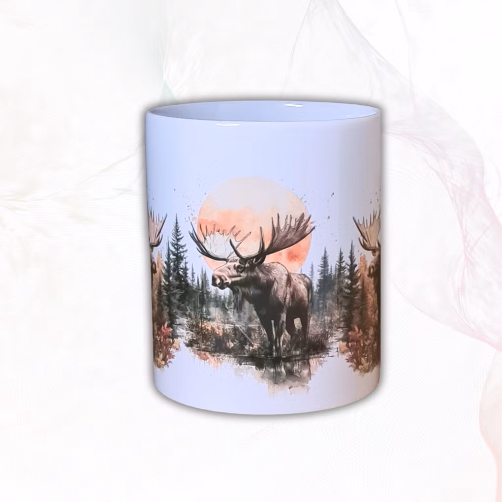 Stilla kvällsljus, gyllene himmel och skogens konung som vakar vid vattnet. En mugg för dig som älskar naturens lugn, höstens färger och doften av kaffe i frisk luft.