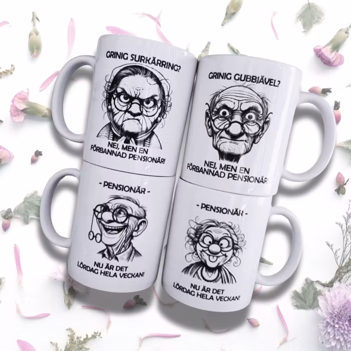 Den här muggen sätter ord på den där speciella pensionära kombon av frihet, åsikter och noll tålamod med trams. Med texten "Grinig gubbjävel? Nej, men en förbannad pensionär!" på båda sidor är budskapet glasklart – även innan första koppen kaffe.