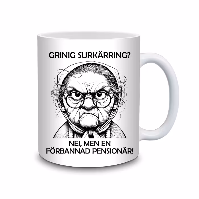 Den här muggen är till för pensionären som inte längre har tid att vara trevlig – bara ärlig. Med texten "Grinig surkärring? Nej, men en förbannad pensionär!" på båda sidor gör den tydligt klart var skåpet ska stå.