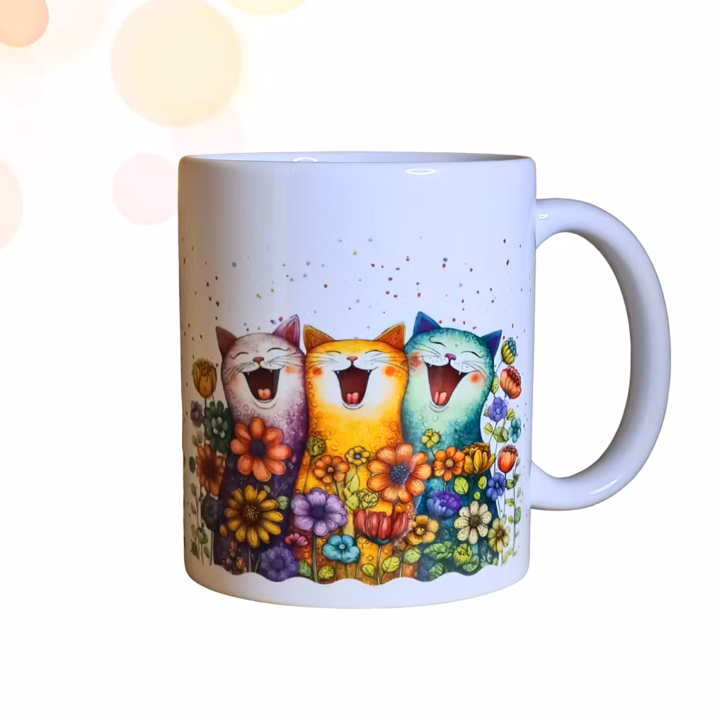 Tre färgglada katter som sjunger av glädje bland blommande ängar – en mugg som sprider härliga vibbar redan vid första anblicken. Perfekt för dig som älskar både färg, katter och livsglädje i porslinsform.Rymmer 325 ml. Tål maskindisk, men handdisk är alltid det bästa.