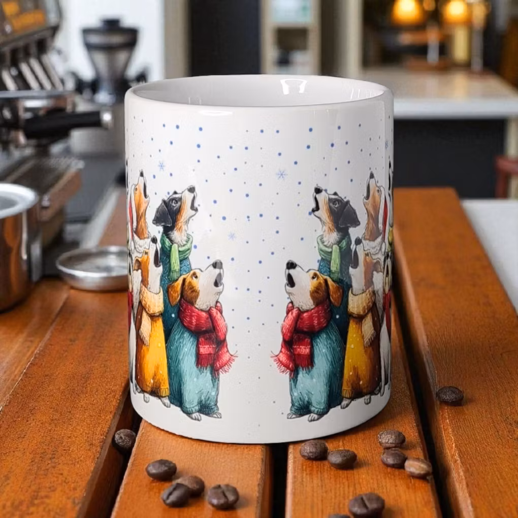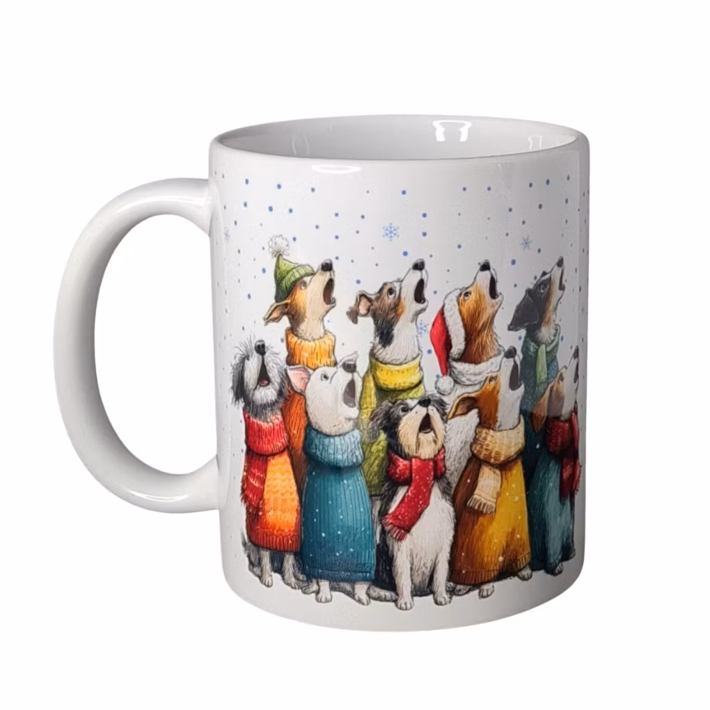 Vinterns härligaste mugg för alla hundälskare! Här står en hel liten hundkör samlad i varma halsdukar och mössor, redo att sprida julstämning med sina glada ylanden. Perfekt att värma sig med kaffe, te eller choklad under vinterdagarna.