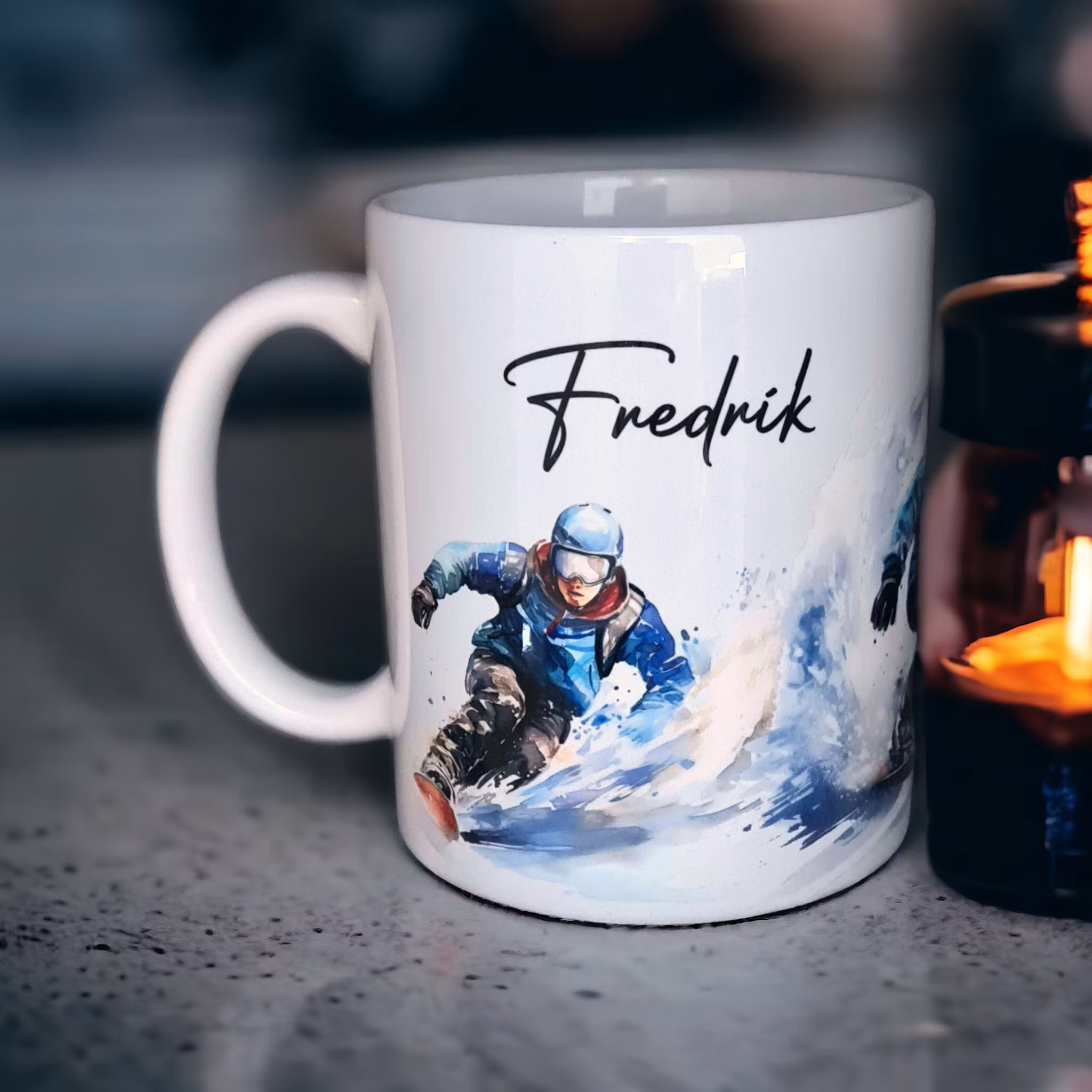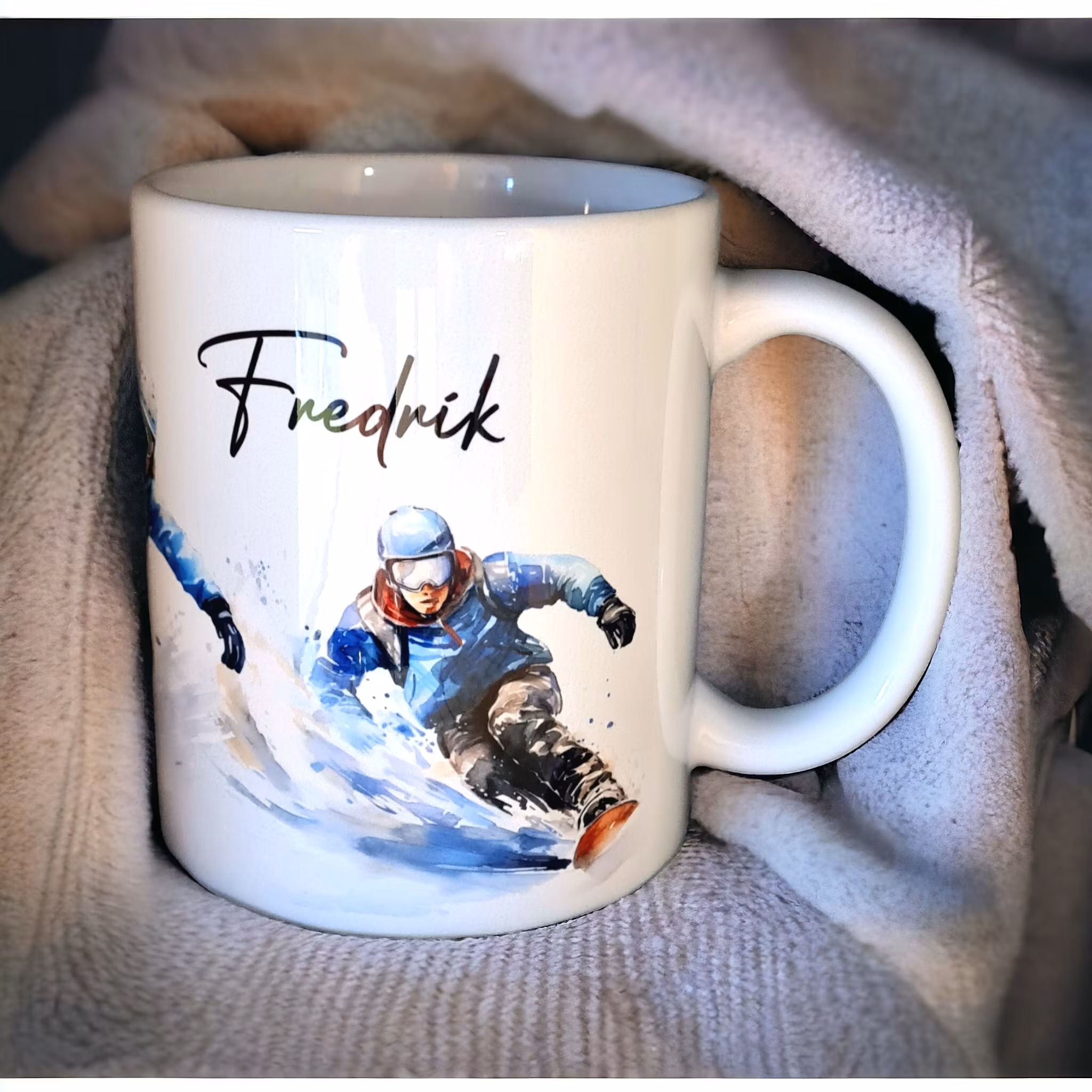 Den här färgsprakande muggen är som gjord för dig som lever för snö, brädor och känslan av att susa nerför berget. Med actionfyllda illustrationer och möjlighet att lägga till namn blir det en personlig favorit – perfekt som present eller som en påminnelse om vinterns äventyr.