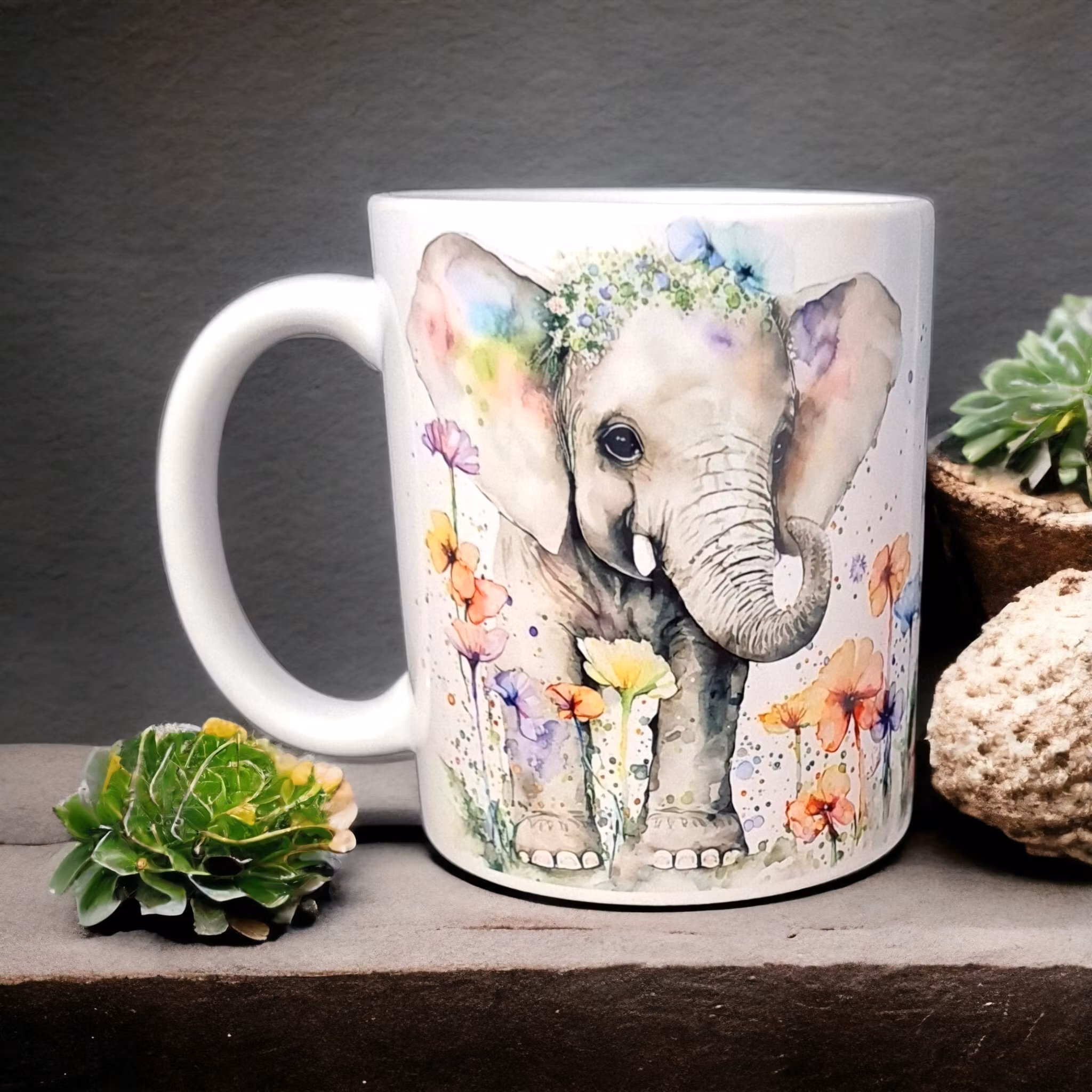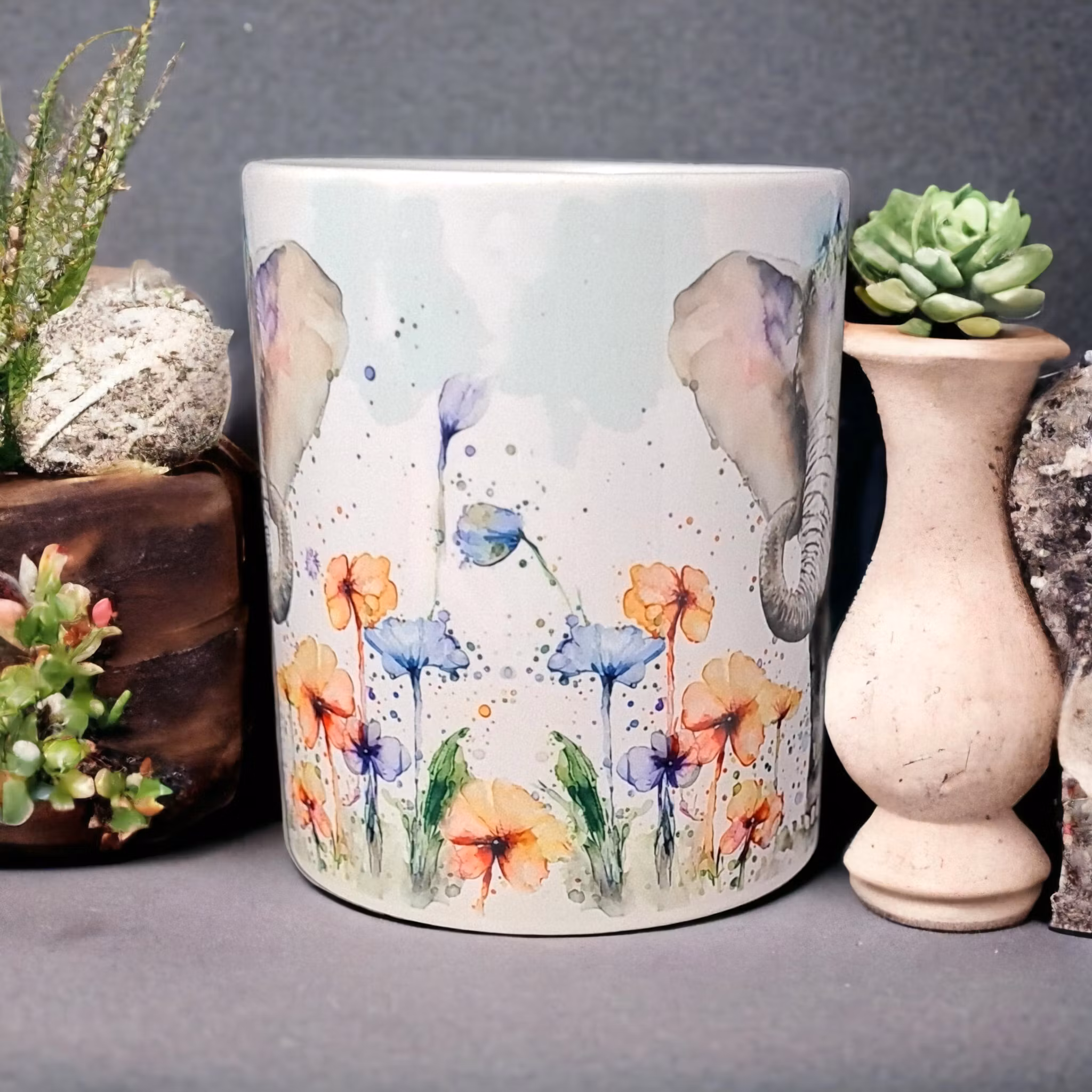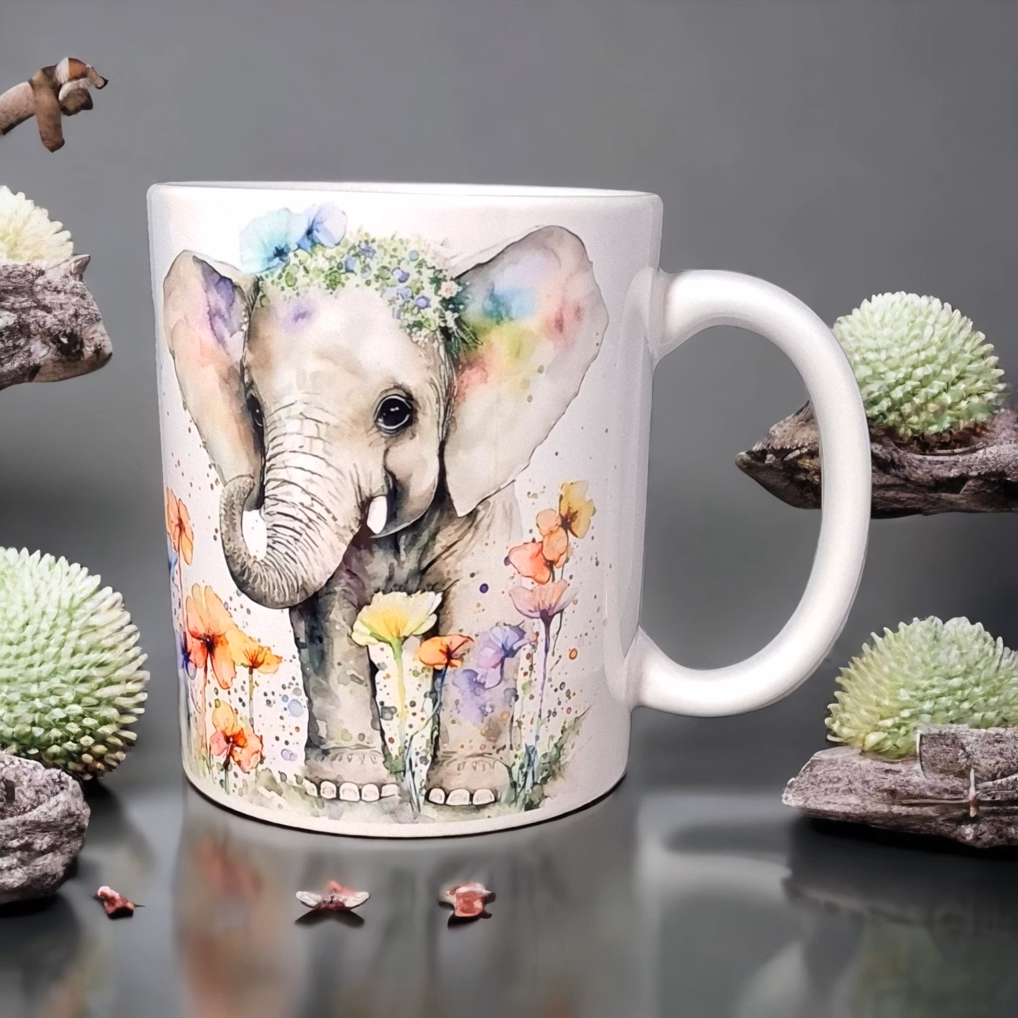 Gudomligt fin mugg med elefanter och blommor i mjuk "vattenfärg"-stil.
