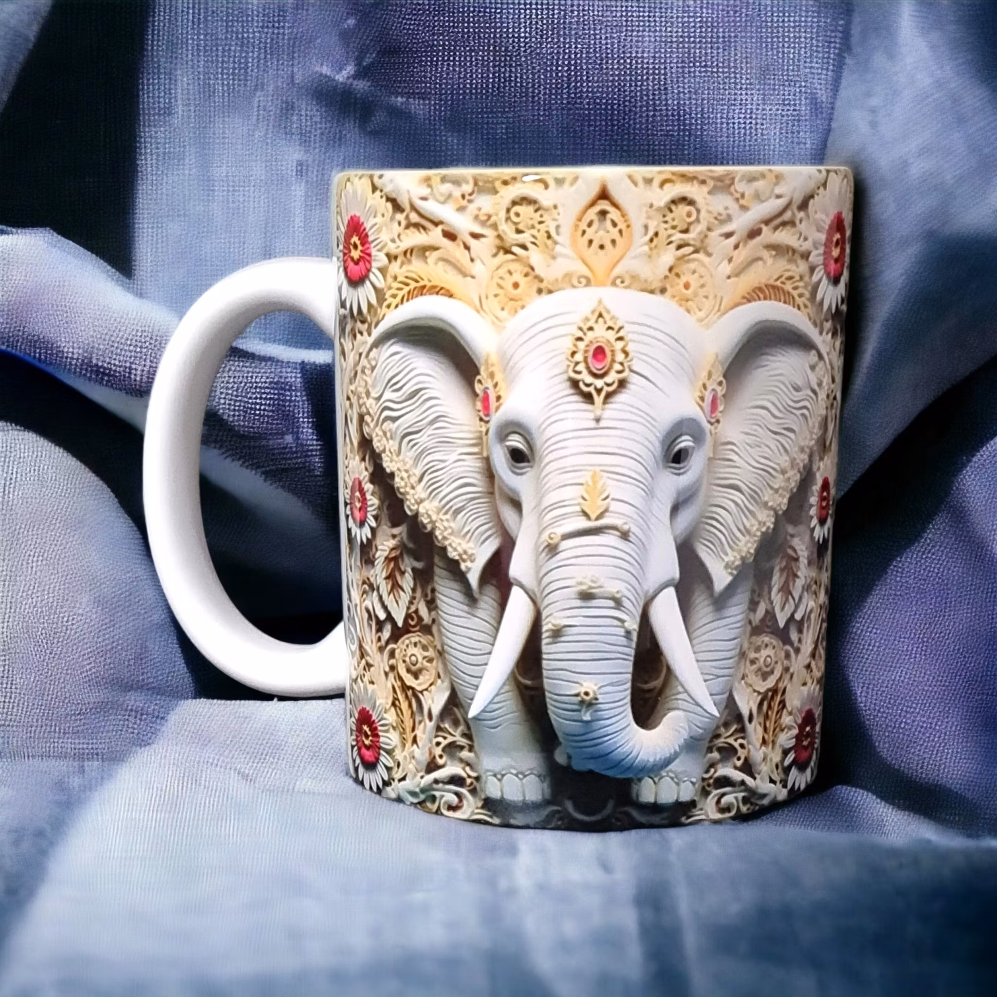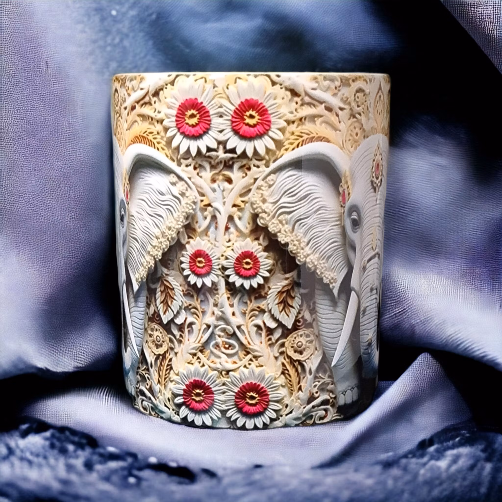 Jättefin och färgstark mugg med elefanter i vacker orientalisk stil.