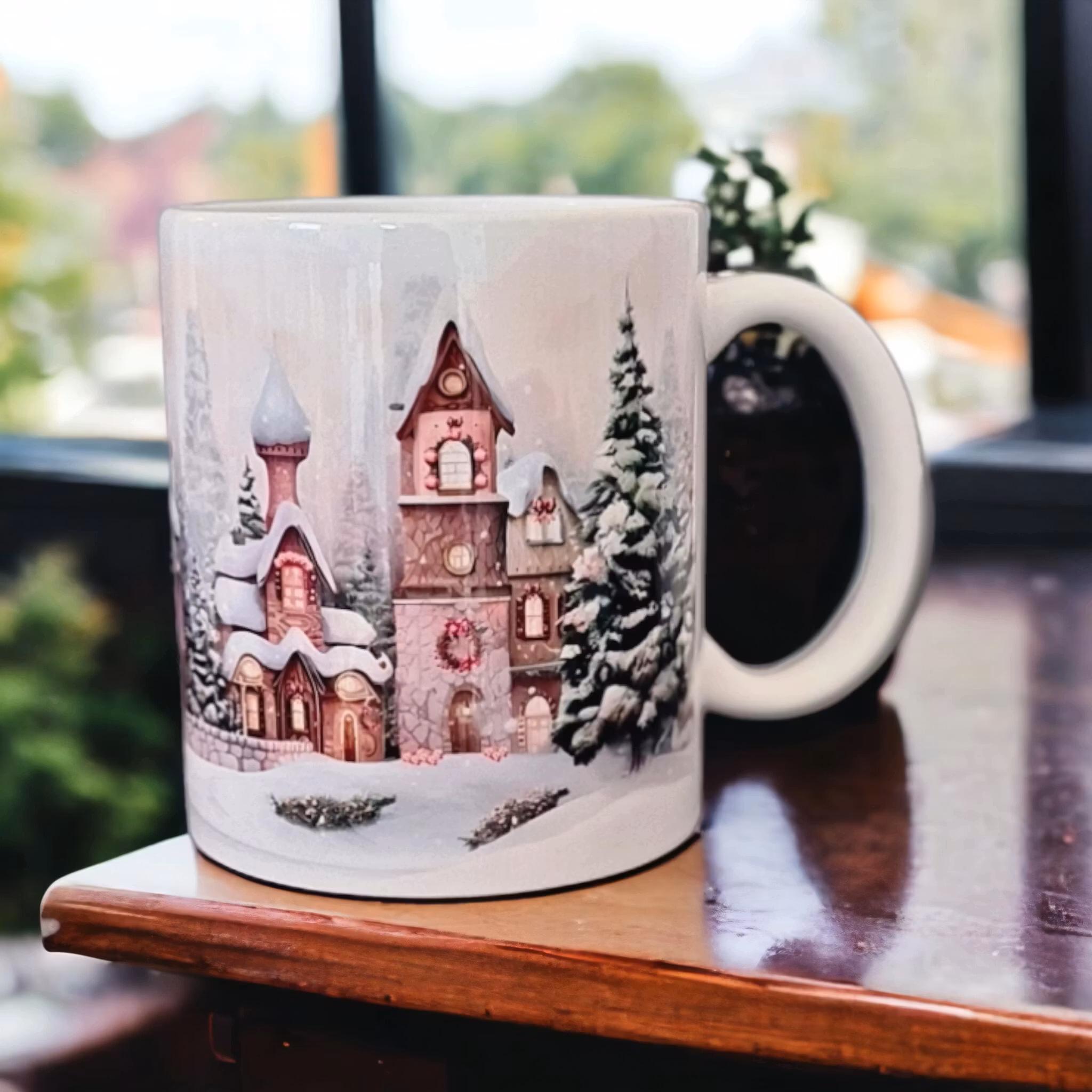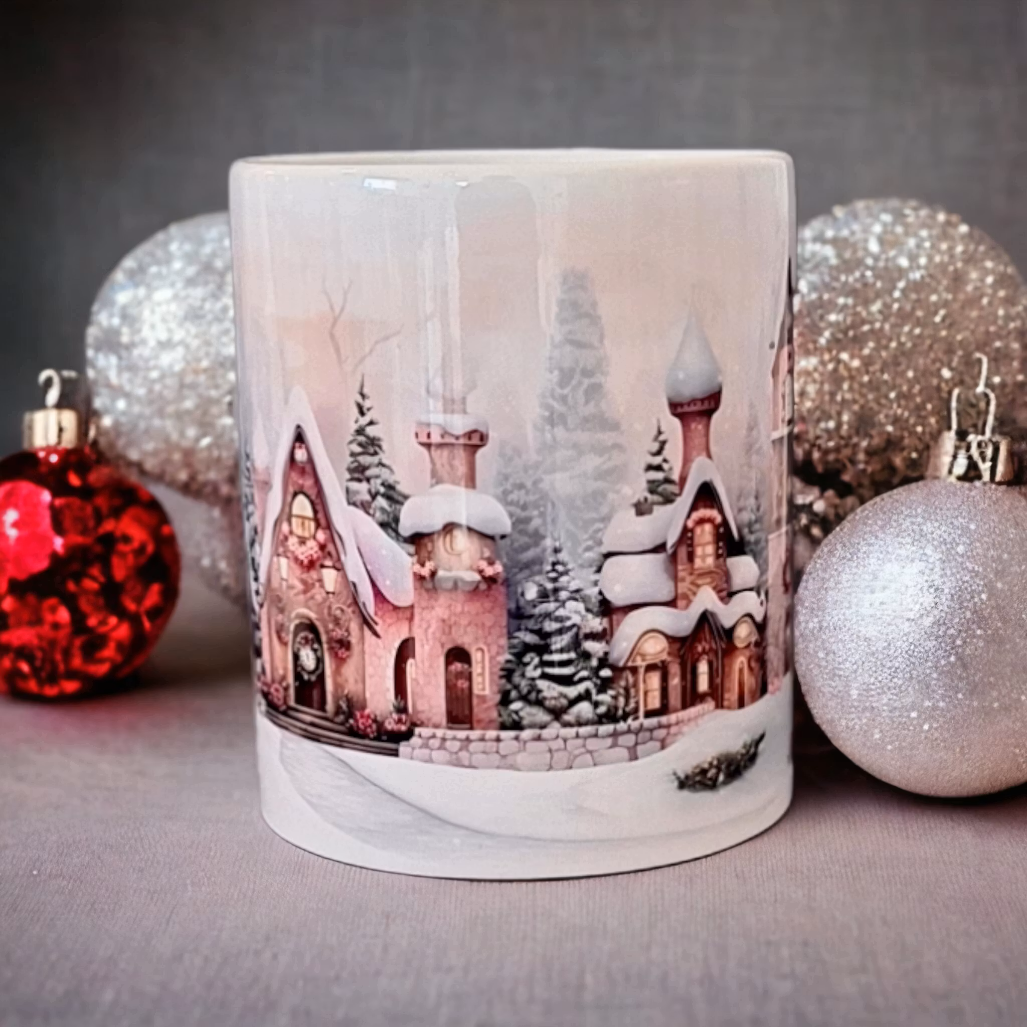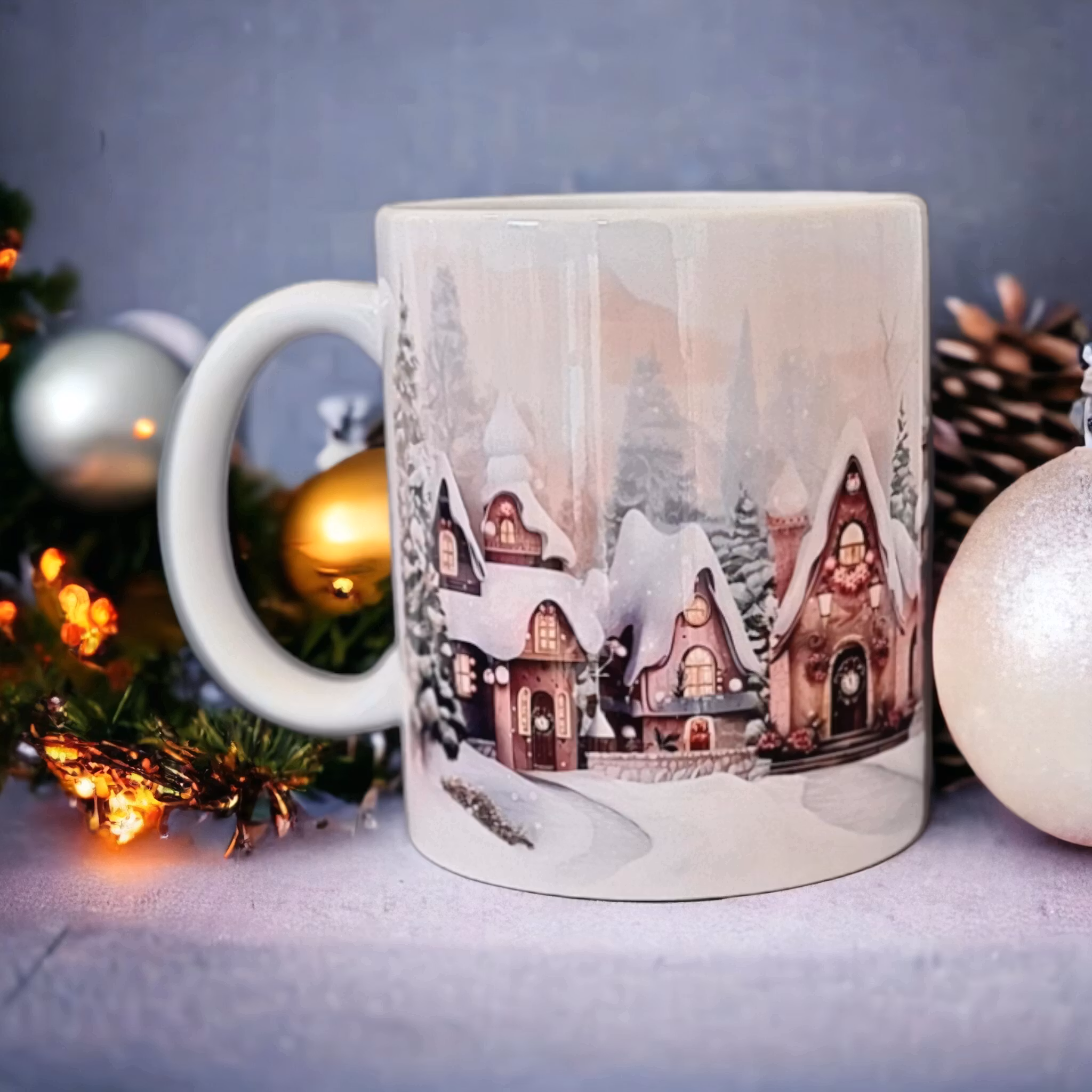 Mugg med stämningsfull, vacker by i fina färger – som hämtad ur en vintrig berättelse.