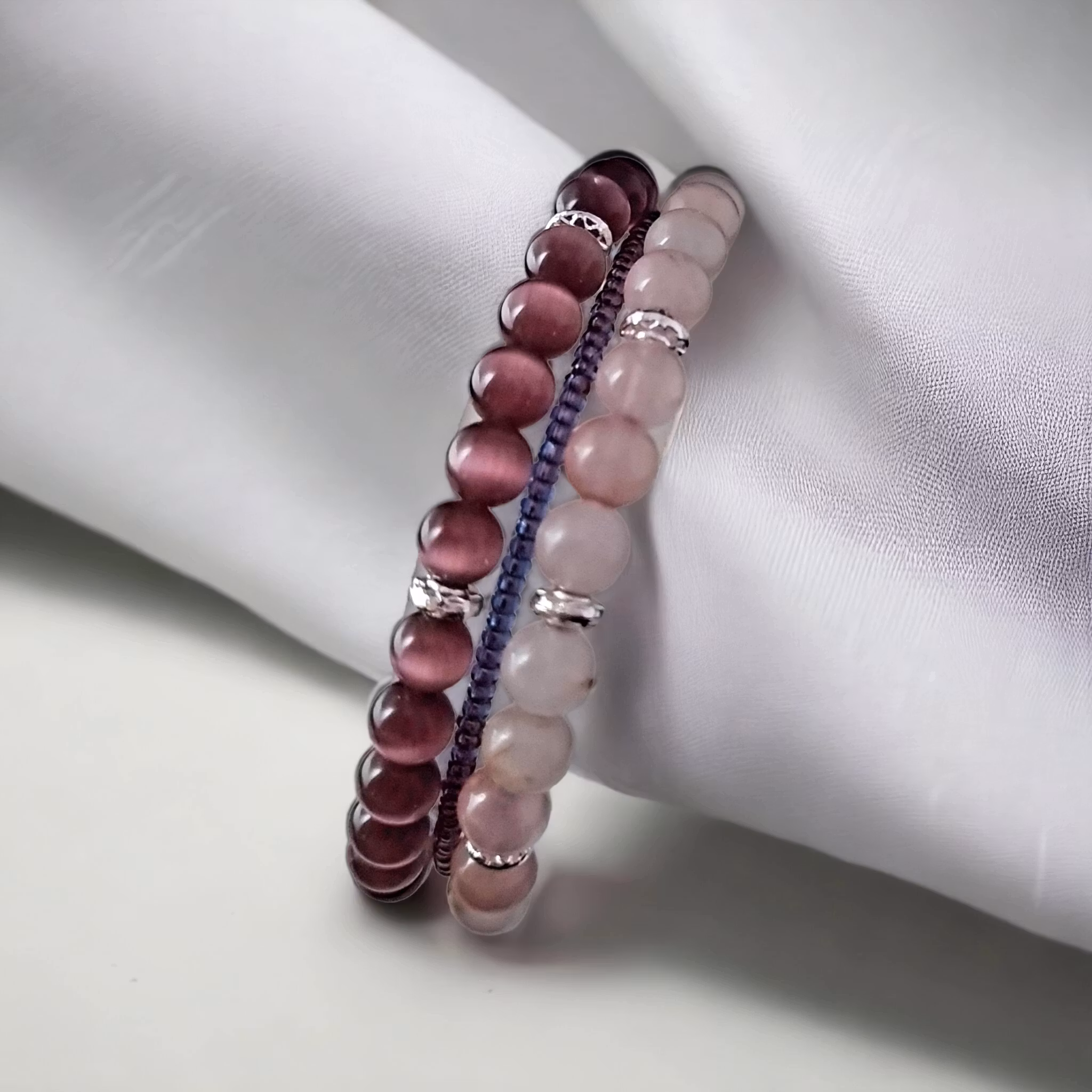 Treradigt armband av memory wire med rosenkvarts och ametister (6mm) + 2 berlocker. Armbandet är lika snygg att bära oavsett om man har berlockerna på bak- eller ovansidan av handleden. Passar de flesta handleder.