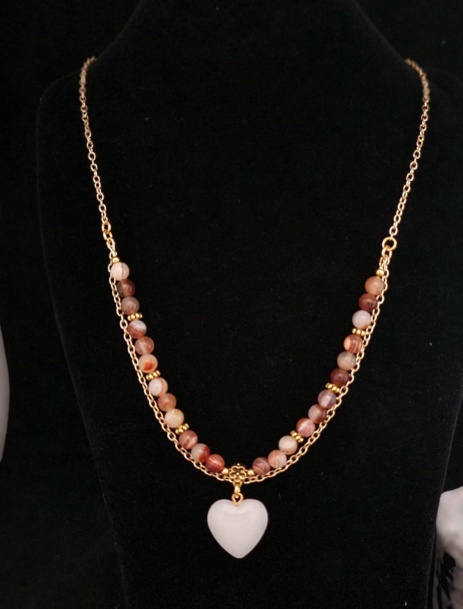 Halsband med guldfärgad kedja och med dubbla rader på nederkant varav en av raderna är med 6mm Sardonyx och ett stort hjärta i vitt. Halsbandet mäter ca 60cm plus en förlängningskedja på 7cm. Nickelfritt.