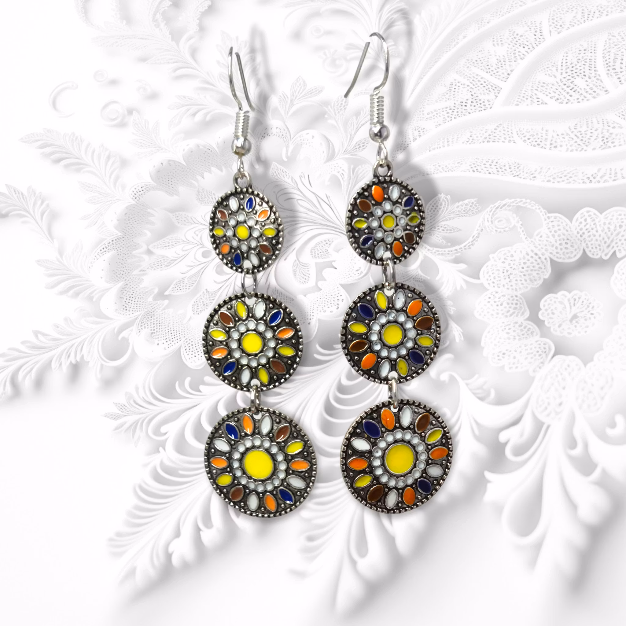 Upptäck dessa örhängen med emaljerade cirklar i gul mix! De här örhängena har en speciell blomma/mandala-design som gör dem till ett perfekt tillbehör för att skapa en unik look. Med dessa fina färger passar de extra bra till påskens festligheter. Öronkrokarna har gummi-stoppers som gör att de sitter ordentligt. Berlockens totala storlek är ca 55x19 mm och de är bly- och nickelfria.