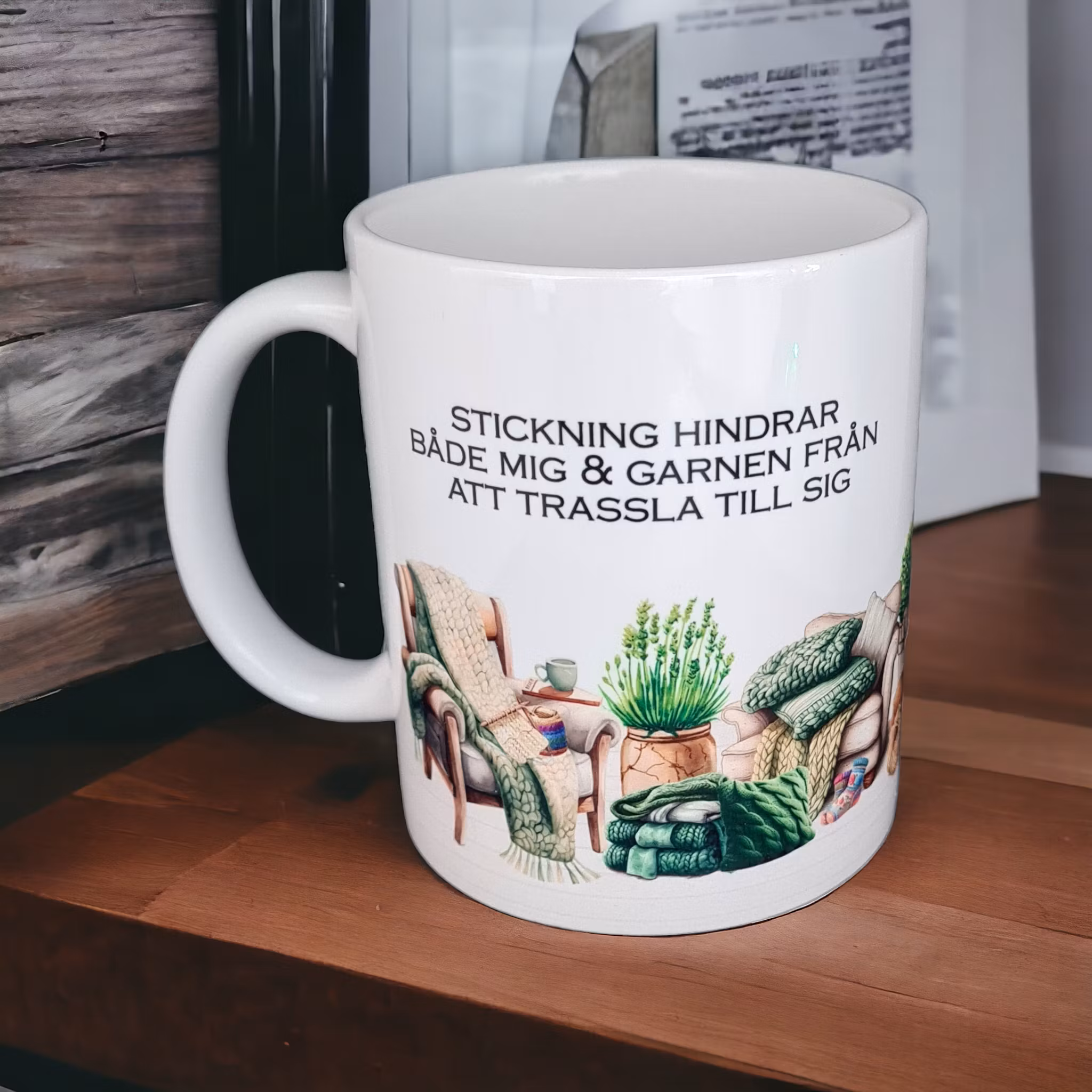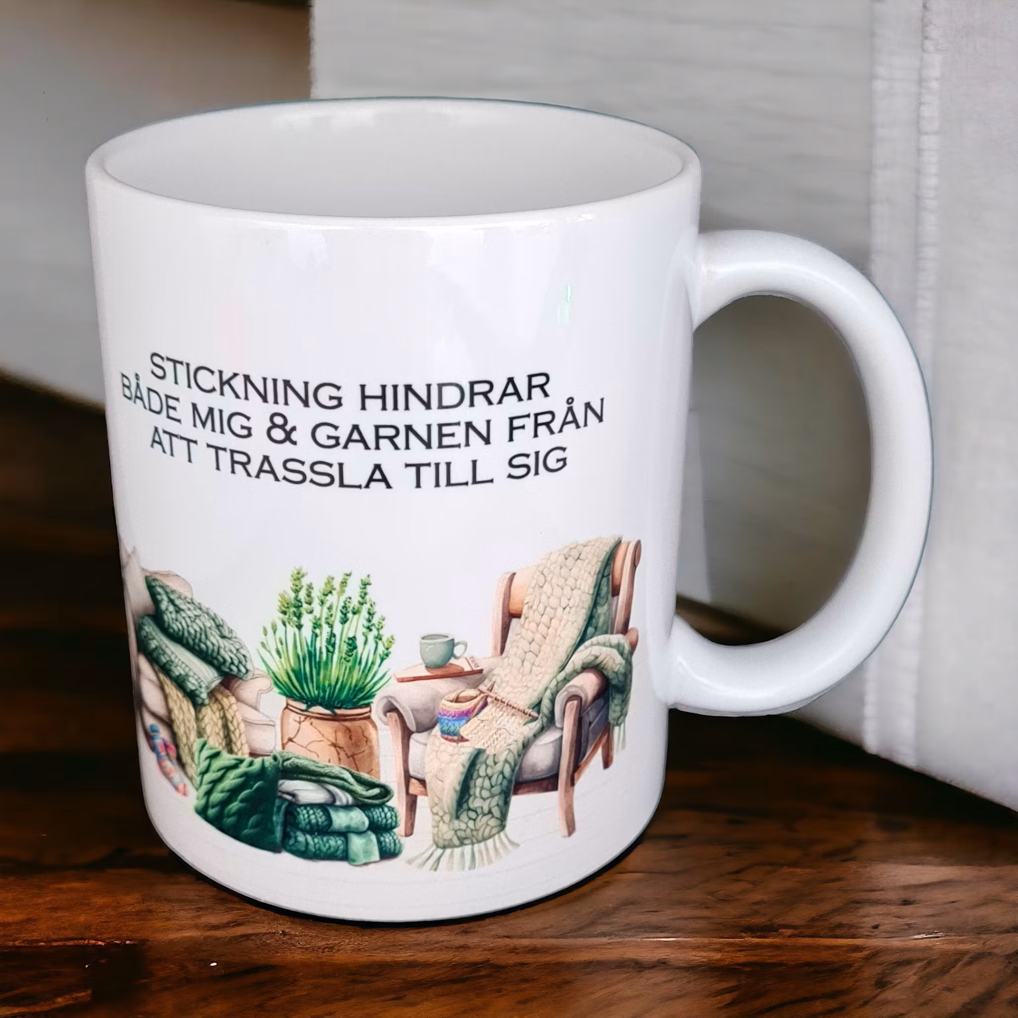 Det ligger mer sanning i det än man kanske vill erkänna. Den här muggen är en kärleksförklaring till handarbete, lugn och terapi i maskor. Perfekt till stickstunden med en kopp värme i handen.