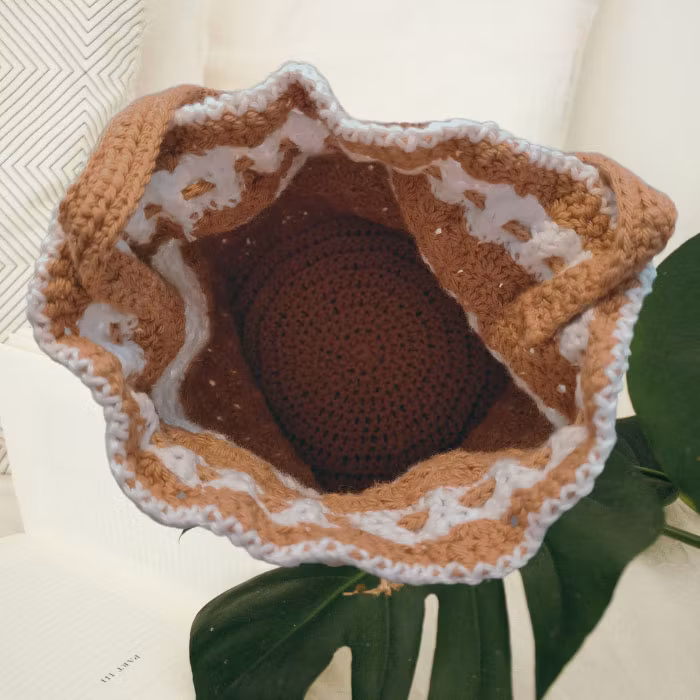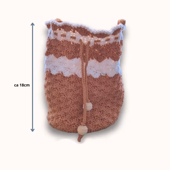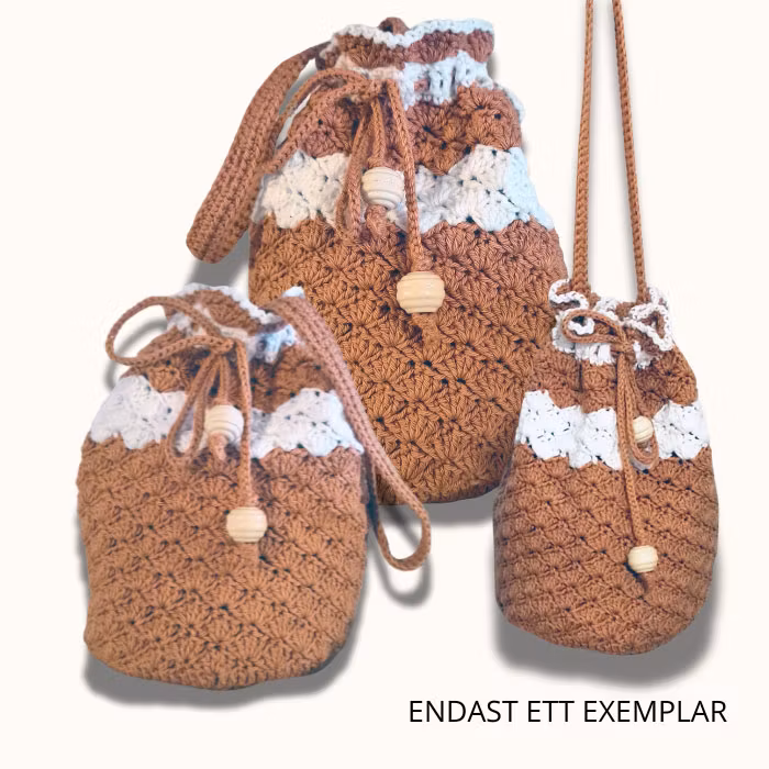 Behändig, mjuk och följsam påsväska med träpärlor som stängs med knytband. Väskan är virkad i ett veganskt garn spunnet i 8/4 tjocklek.