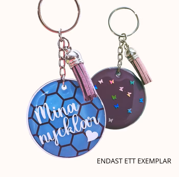Nyckelring tillverkad av akryl med skyltvinyl och små dekorationsfjärilar. Den har även en försegling av resin som ger en högblank effekt samtidigt som den skyddar dekorationen. På fotot ser du fram- och baksidan. Nyckelringen finns endast i ett exemplar men du kan gärna bevaka produkten så får du ett meddelande om/när liknande produkt återigen finns i lager.