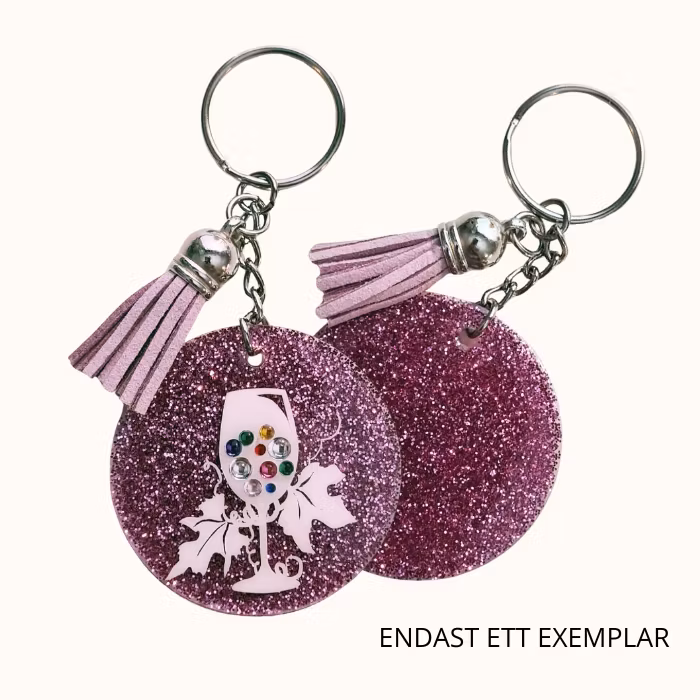 Nyckelring tillverkad av akryl med skyltvinyl och glitter. Den har även en försegling av resin som ger en högblank effekt samtidigt som den skyddar dekorationen. På fotot ser du fram- och baksidan. Nyckelringen finns endast i ett exemplar men du kan gärna bevaka produkten så får du ett meddelande om/när liknande produkt återigen finns i lager.