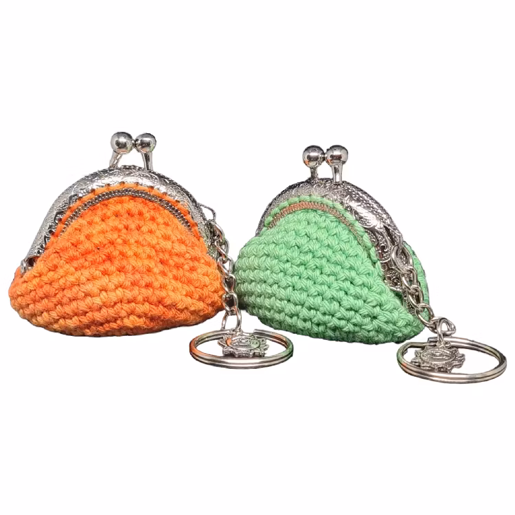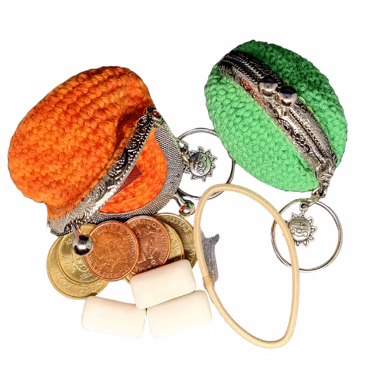 Handvirkad börs med nyckelring. Så söt att ha lite smågrejer i såsom hårsnodd, tuggummi, värktabletter, pengar med mera. Metallknäppet är ca 5cm bred.