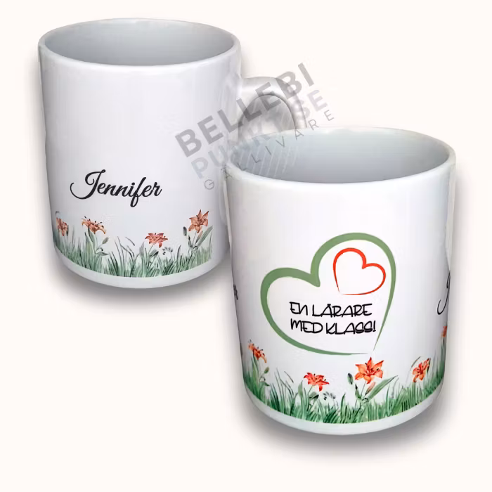 Denna mugg hittar jag inga direkta fel på, möjligtvis att trycket sitter försvinnande lite, lite snett. Muggen har aldrig varit ute till försäljningen då jag inte gick vidare med just denna design. Känner du någon lärare som heter Jennifer (kanske du själv), så är detta en söt och somrig mugg att ha i sin ägo. Handdisk rekommenderas. 2:a sortering