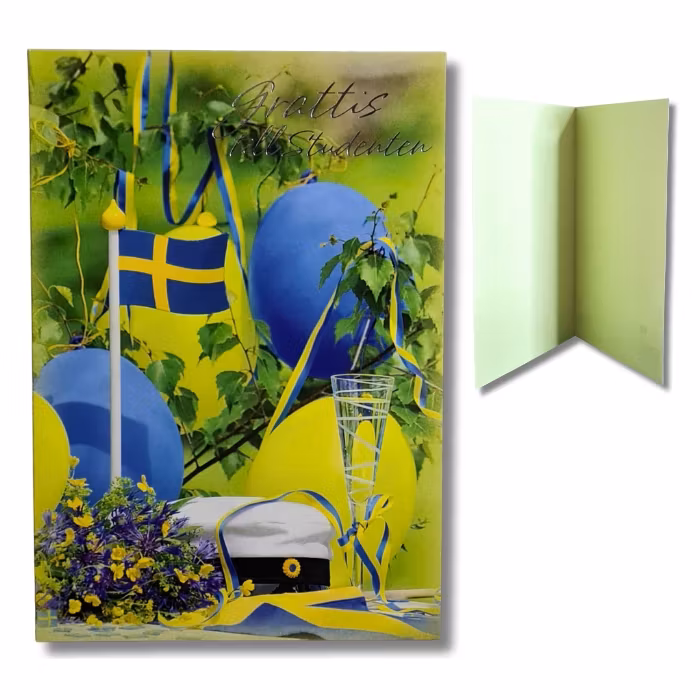 Dubbelkort med flagga och ballonger 39 kr I lager. LÄGG I VARUKORGEN Dela Produktbeskrivning Dubbelkort med text i silverfolie "Grattis till Studenten". Insidan är svagt grön.Vitt kuvert medföljer. Mått ca 17x11,5 cm.
