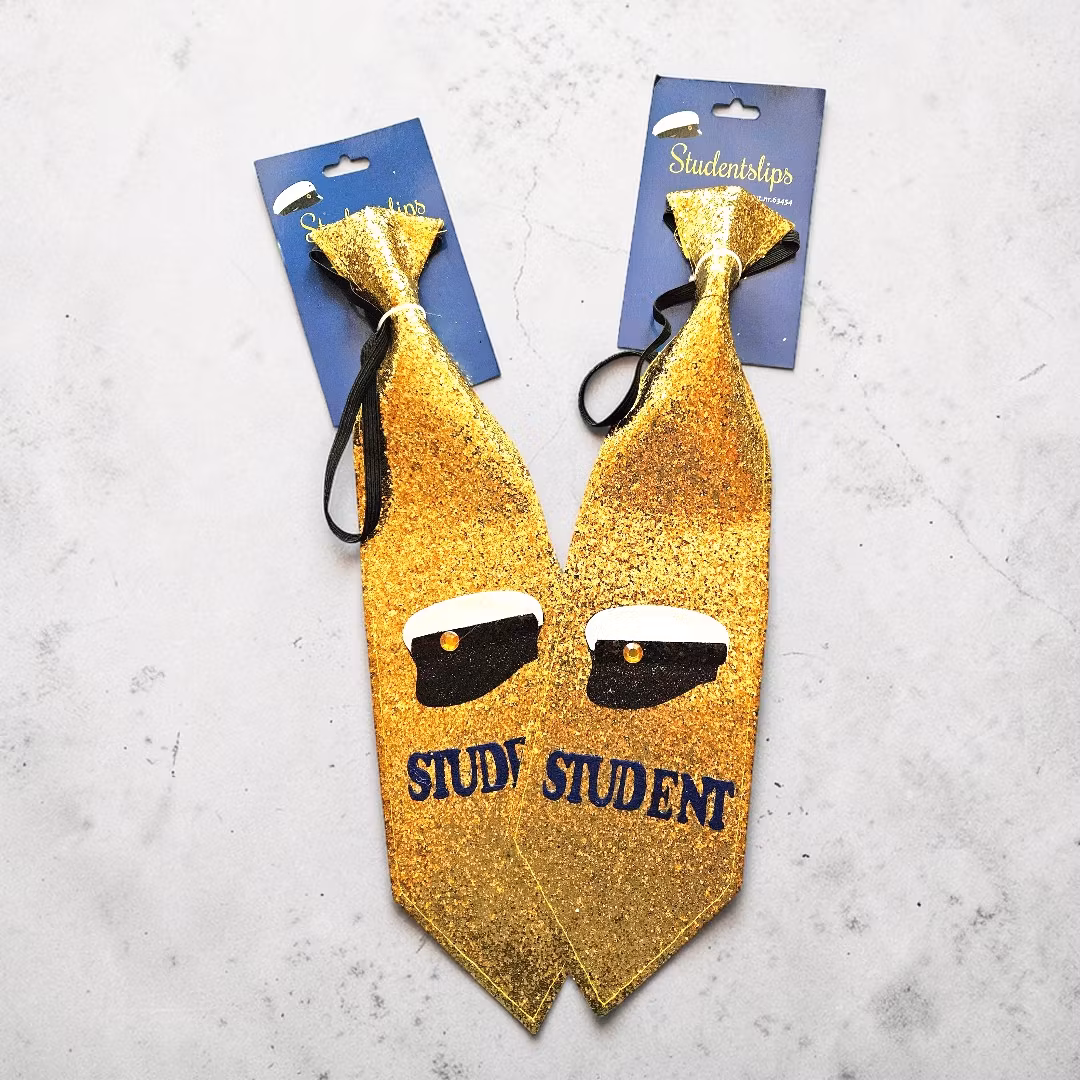 Studentfest. Den här slipsen i blått eller guld, full med glitter och precis lagom överdriven är allt man behöver när det är dags att fira på riktigt. Den åker på lika självklart till utspringet som till flaket och festen efter. Texten “Student” och den lilla mössan med extra bling gör att den syns, precis som studenten själv ska göra den dagen. Elastiskt band, så det är bara att dra den över huvudet och köra, sitter där den ska oavsett hur/om firandet spårar ur. Denna slips är inte lämplig för barn under 14 år.