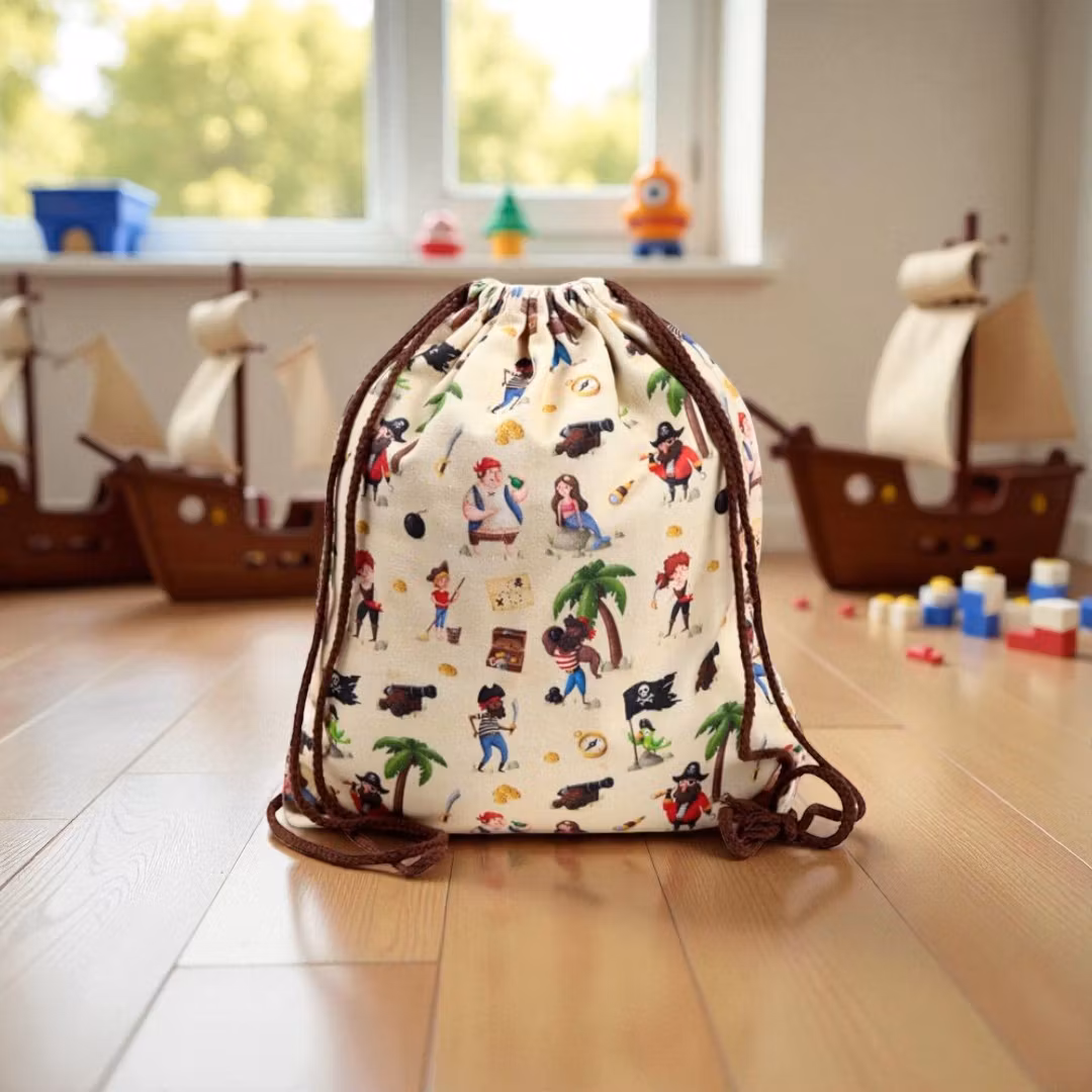 Praktisk och färgglad dragskoväska med illustrationer av pirater, Jolly Roger. Tillverkad i slitstark bomull med bruna dragsnören som fungerar både som