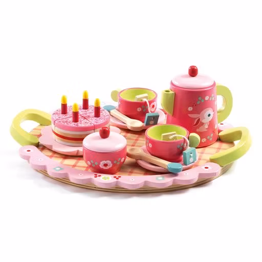 Härlig servis i trä i snygga rosa och gröna nyanser. Med tekoppar, fat, tekanna, sockerskål, tårta med fyra bitar, tepåsar, teskedar och bricka.