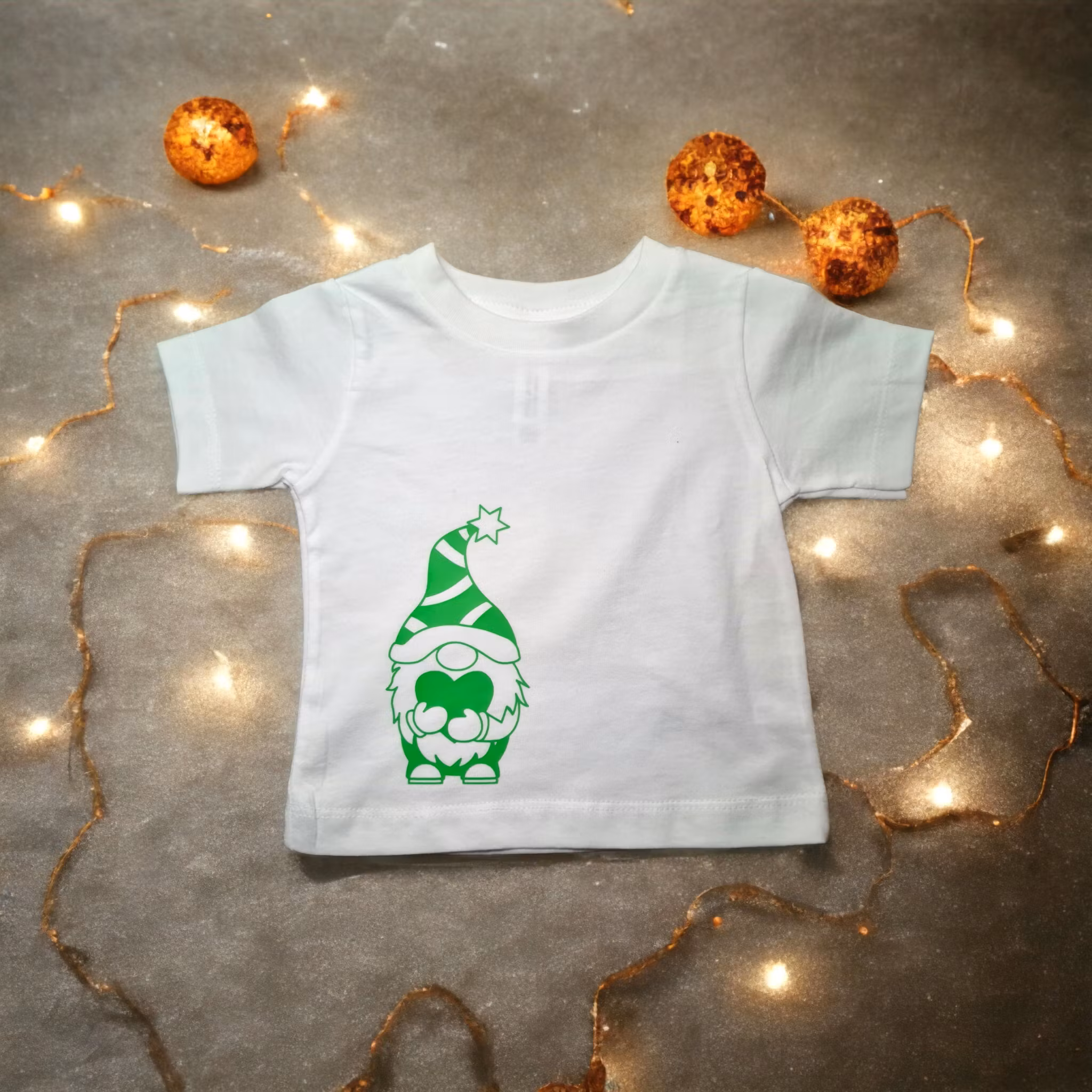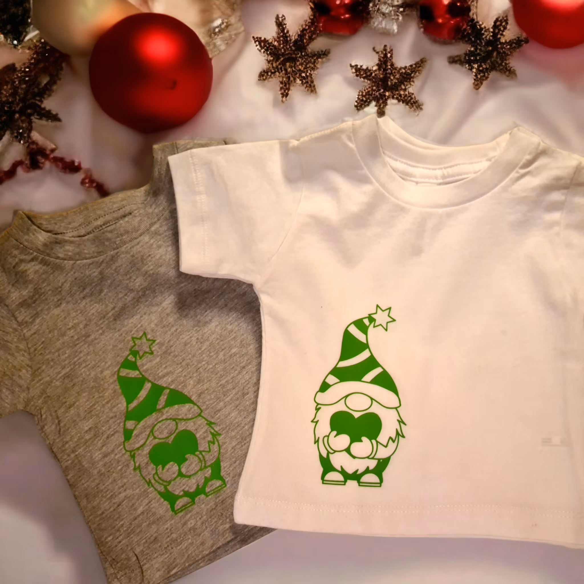 T-shirt med tomte i storlek 3-6 månader. Den vita t-shirten är i 100 % bomull och den grå är i 90 % bomull och 10% polyester. Maskintvätt 40 grader.