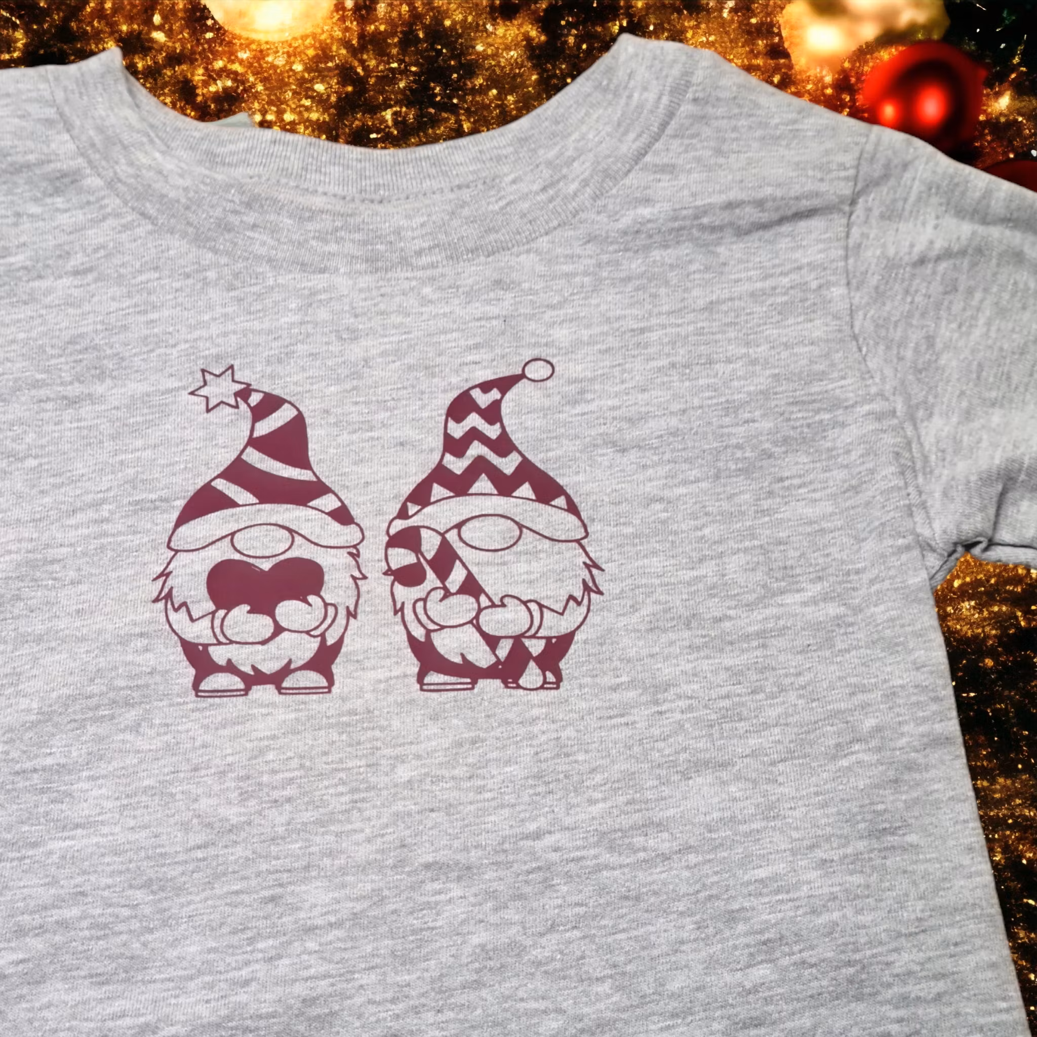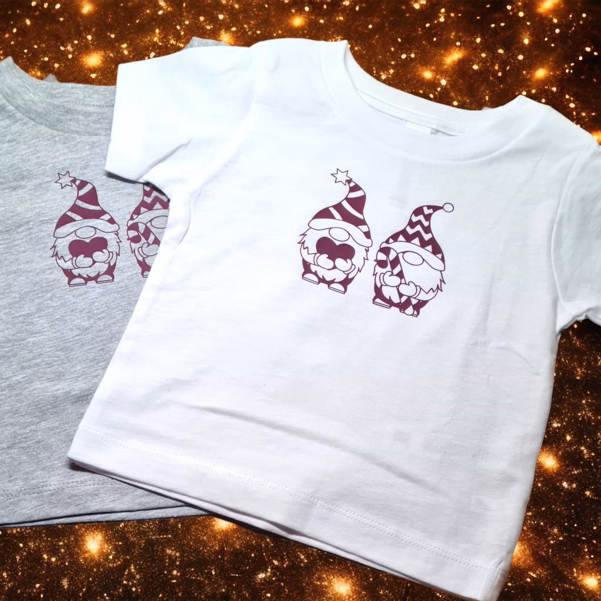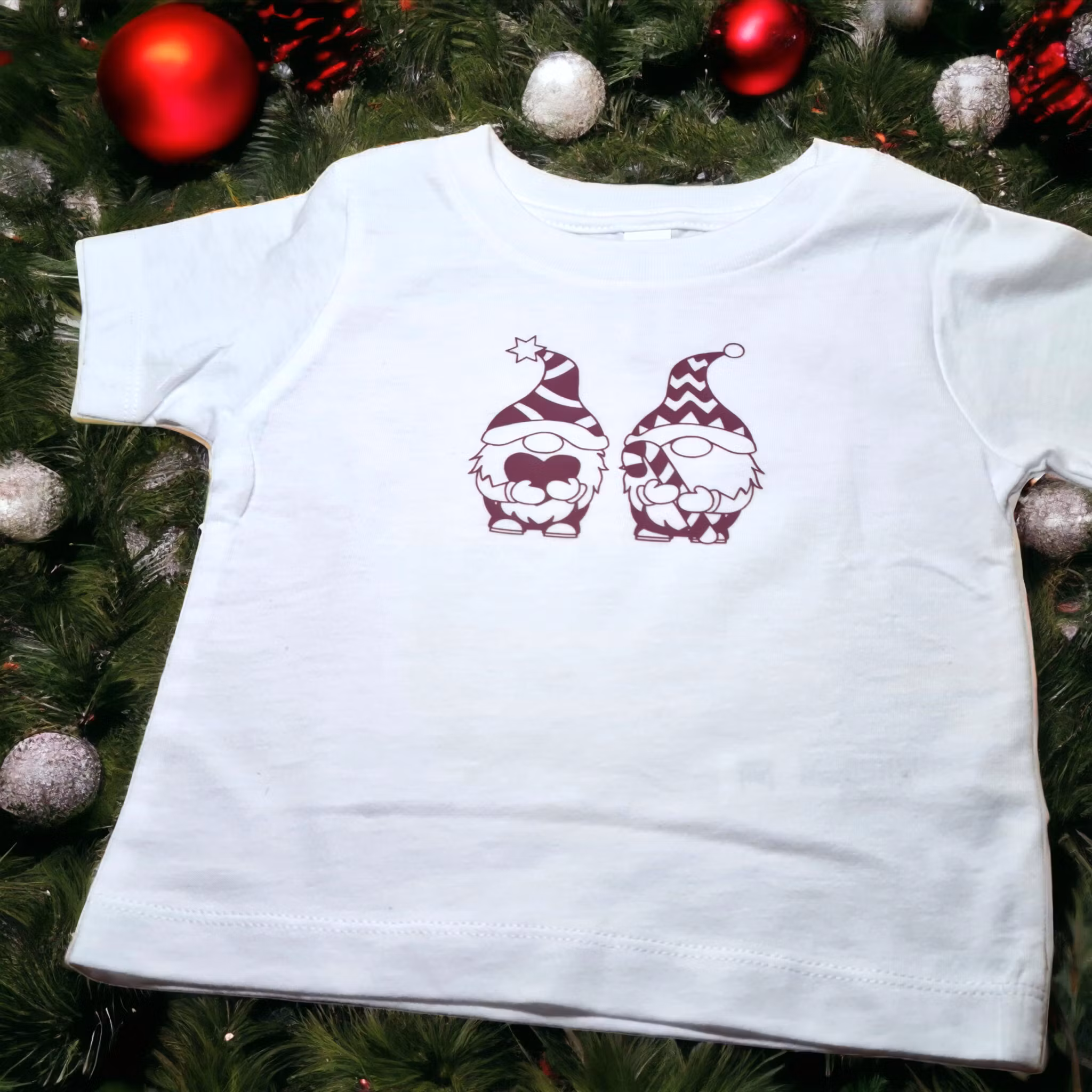 T-shirt med två tomtar i storlek 6-12 månader. Den vita t-shirten är i 100 % bomull och den grå är i 90 % bomull och 10% polyester. Maskintvätt 40 grader.